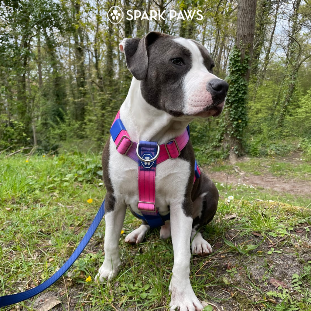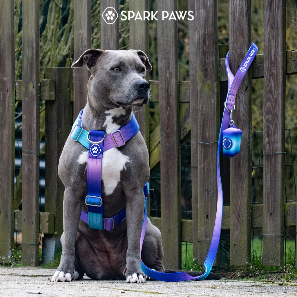 Cada conjunto viene con un Arnés para perros sin tirones, una correa de neopreno a juego y un porta bolsas de excremento.