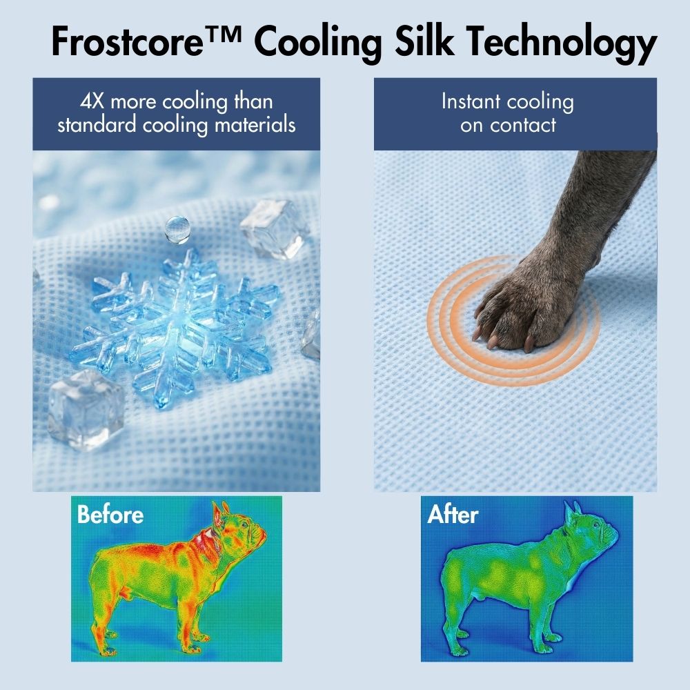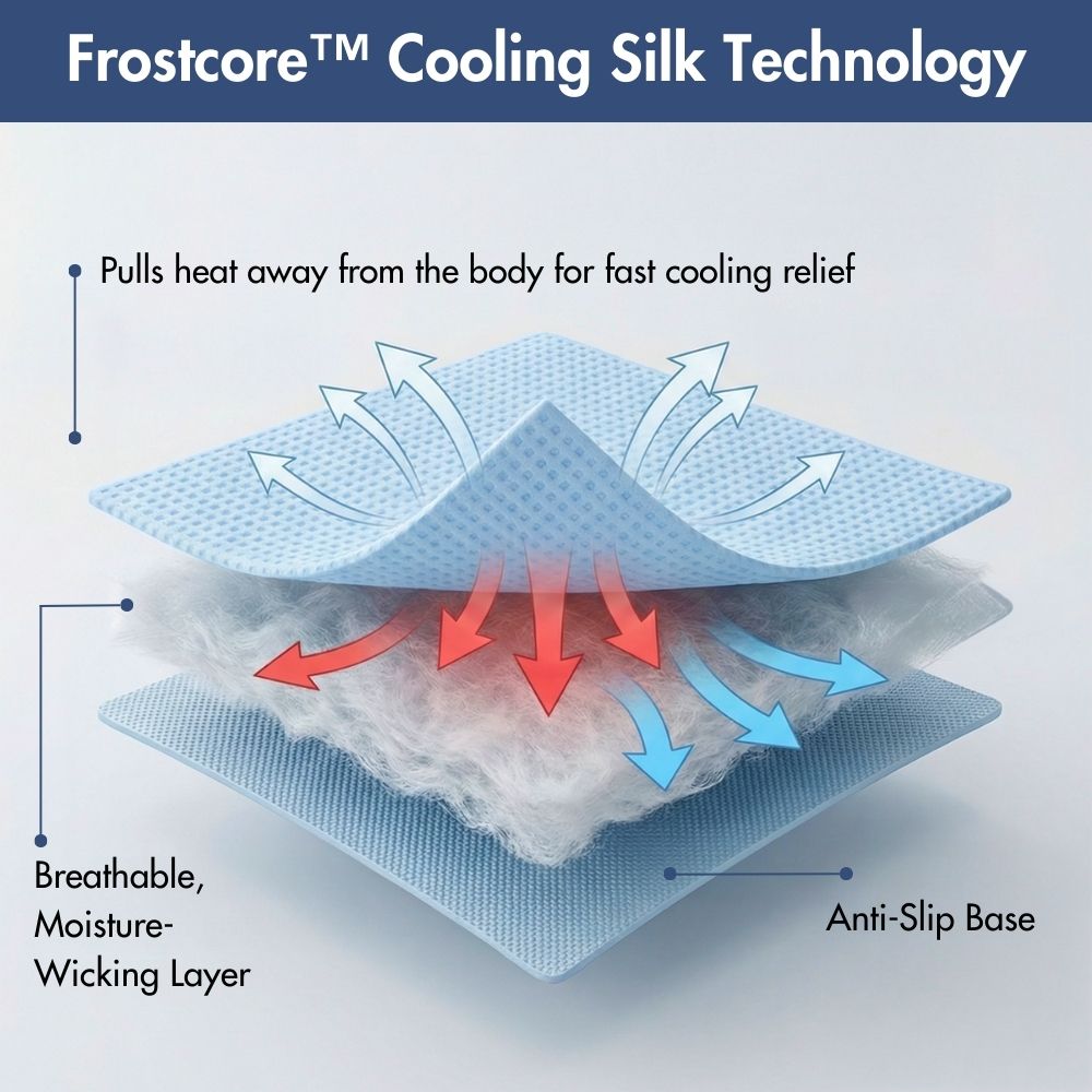 • Fabricada con tejido refrigerante Frostcore™, la superficie disipa el calor al contacto para ofrecer una sensación de frescor instantánea y reconfortante, ideal para los días calurosos.