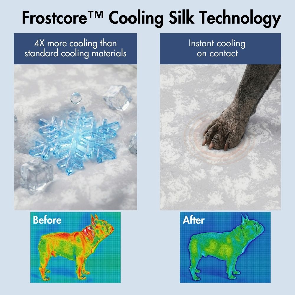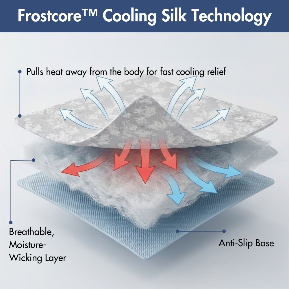 Fabricada con tejido refrigerante Frostcore™, la superficie disipa el calor al contacto para ofrecer una sensación de frescor instantánea y reconfortante, ideal para los días calurosos.