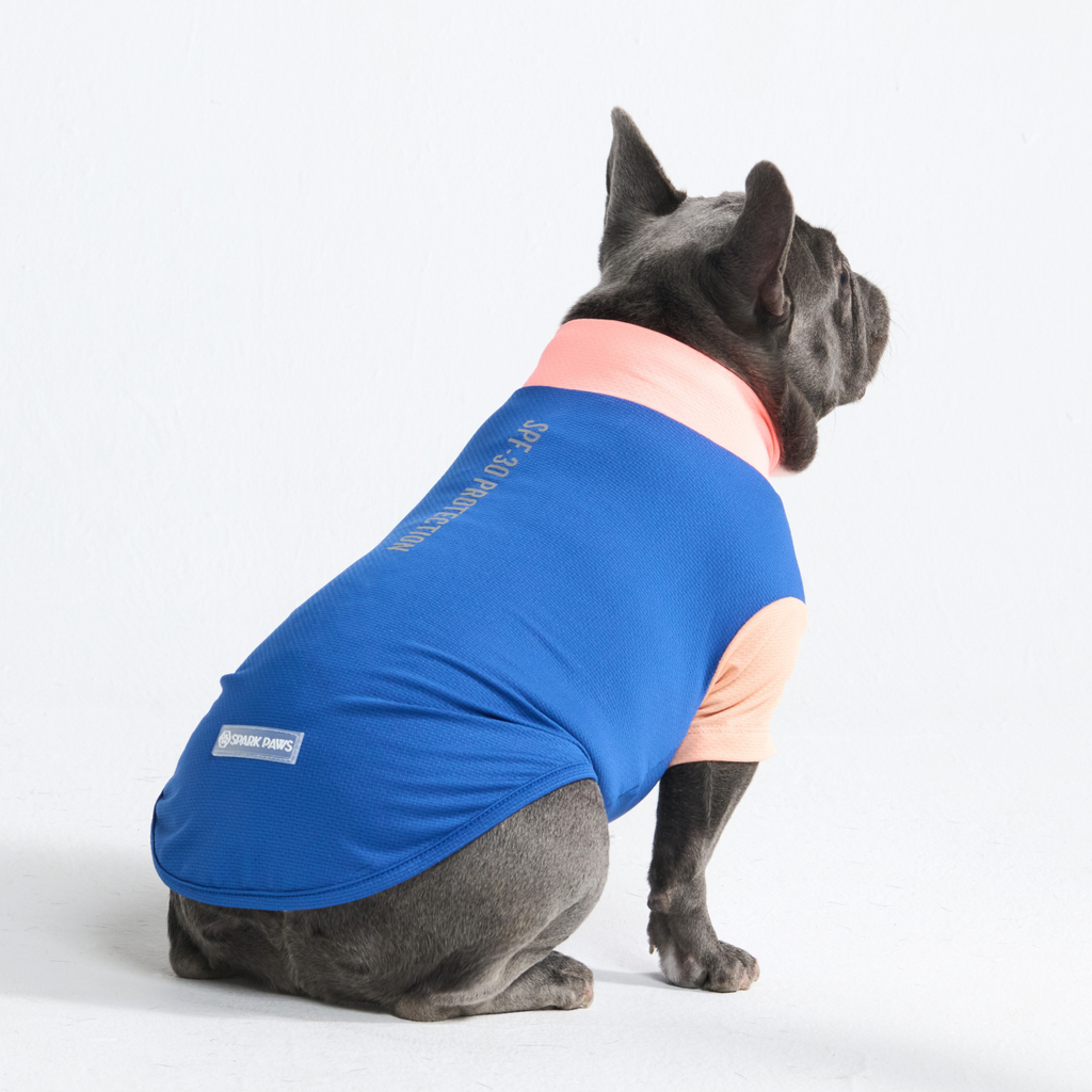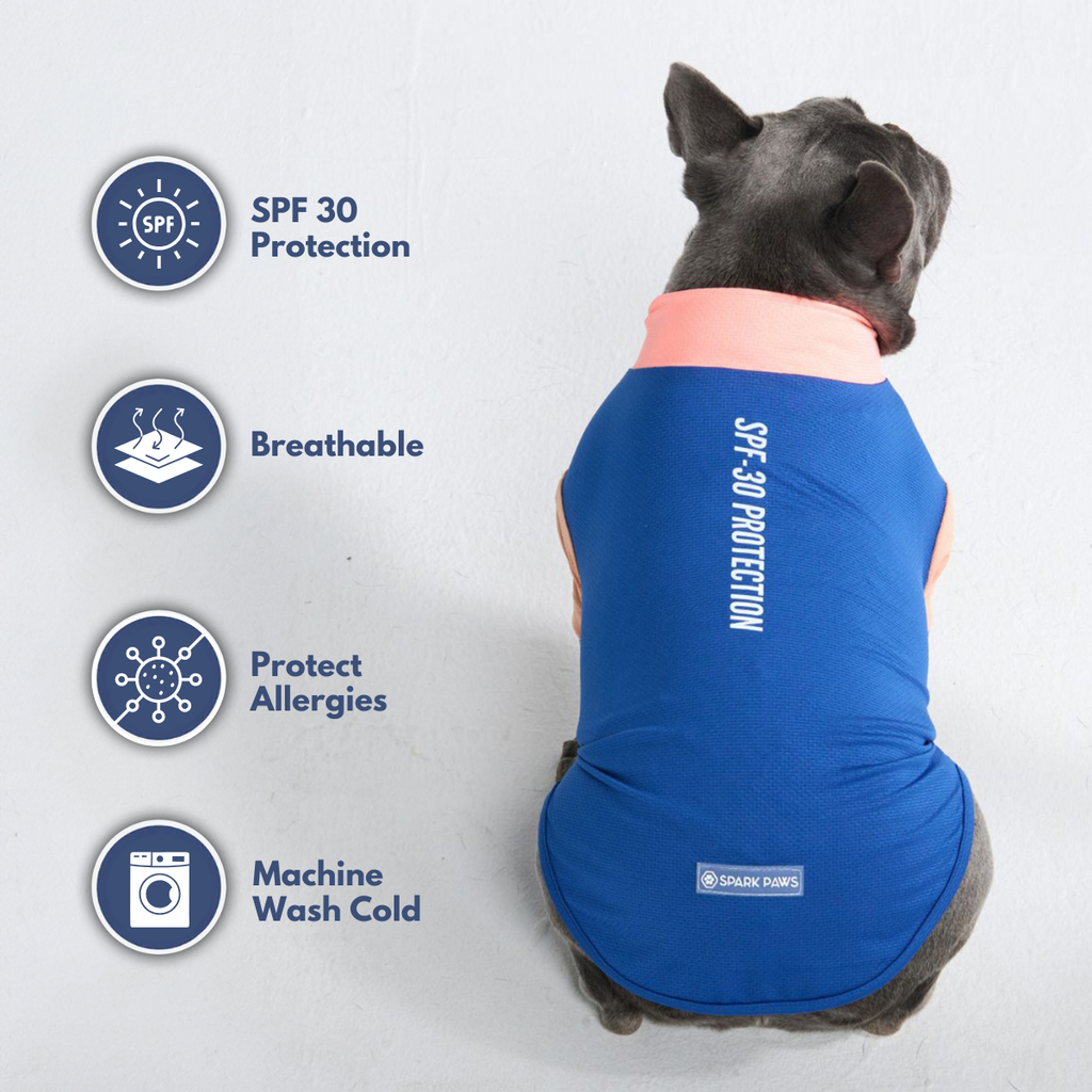 Protege a tu perro del sol con nuestra camiseta Sun-Block para perros SPF-30, que bloquea el 97% de los rayos UVB nocivos mientras mantiene a tu perro limpio y libre de alérgenos.
